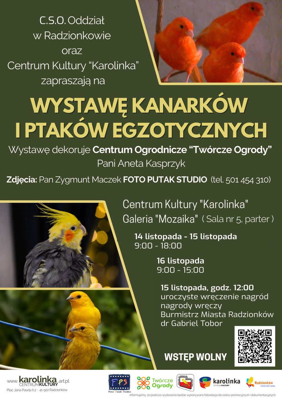 Centralne Stowarzyszenie Ornitologiczne Oddział Radzionków oraz Centrum Kultury "Karolinka" zapraszają na Wystawę Kanarków i Ptaków Egzotycznych.