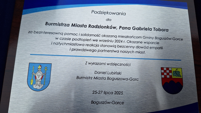 W sobotę, 26 lipca, z rąk Burmistrza oraz Przewodniczącego Rady Miasta Gminy i Miasta Boguszowa-Gorc, Burmistrz Gabriel Tobor odebrał podziękowanie za pomoc, jakiej udzieliło Miasto Radzionków w czasie zeszłorocznej powodzi naszemu miastu partnerskiemu.